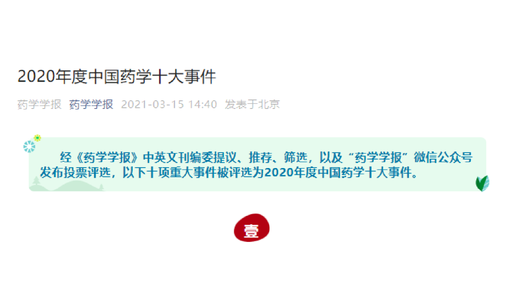 The research achievements of the research team, together with the other nine events, such as the overseas approval of the domestic COVID-19 vaccine and the promulgation of the Chinese Pharmacopoeia, were rated as the top ten pharmaceutical events in China in 2020 by the Journal of Pharmacy