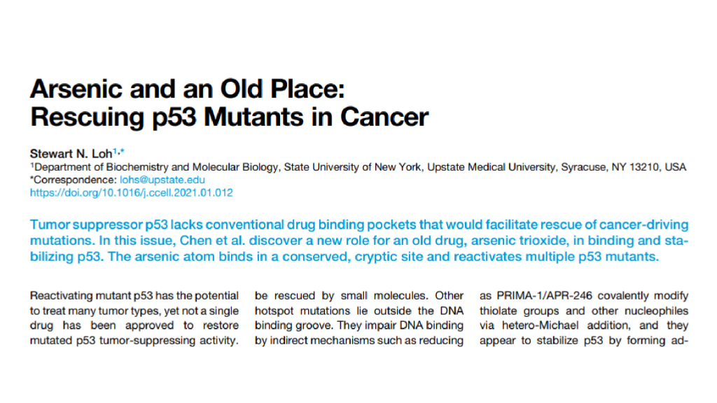 The research achievement of the research group that arsenic trioxide restores the anti-cancer function of p53 structural mutant has been interpreted in a long article in Cancer Cell